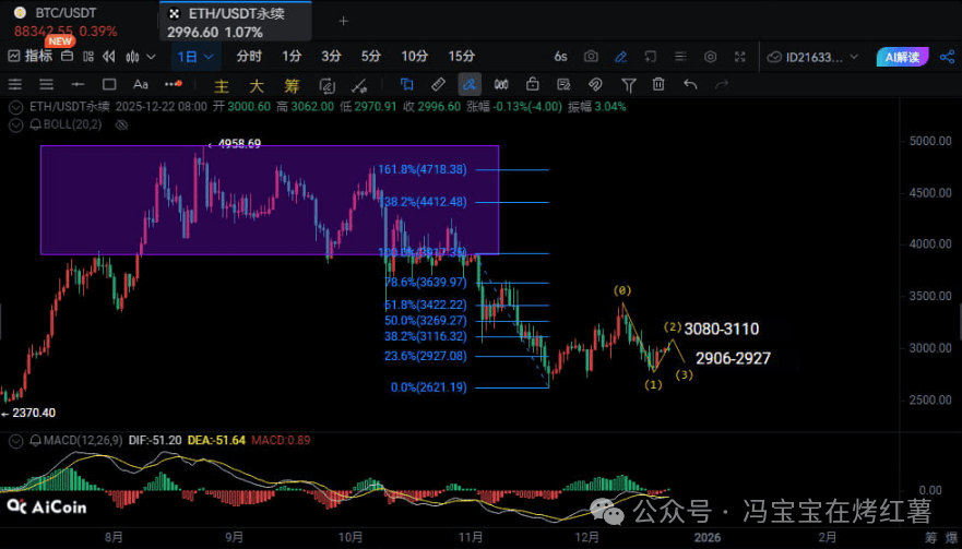 以太坊日線呈現頭肩頂形態,早間價格觸及右肩高點3080附近後回落至3000調整。生命線在2800,短期支撐2906-2927,上方壓力3080-3110。目前整體偏空,但短期有反彈可能,只要站穩3080-3100上方,趨勢有望轉多。
