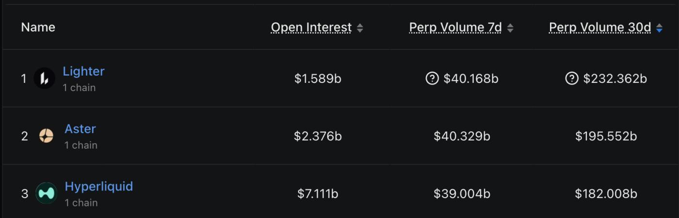 - Lighter:交易量 2323 億美元,暫居榜首,佔比約 26.6%。