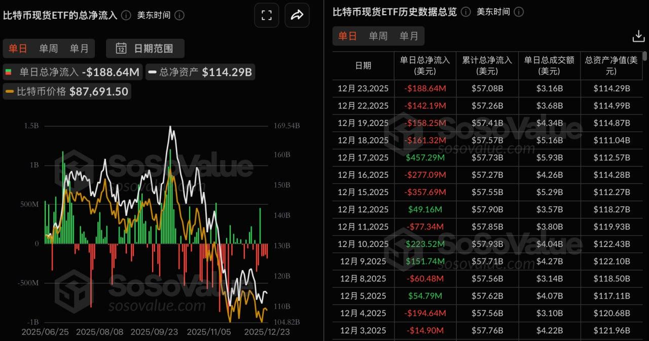 根據 SoSoValue 數據,昨日(美東時間 12 月 23 日)比特幣現貨 ETF 總淨流出 1.89 億美元。