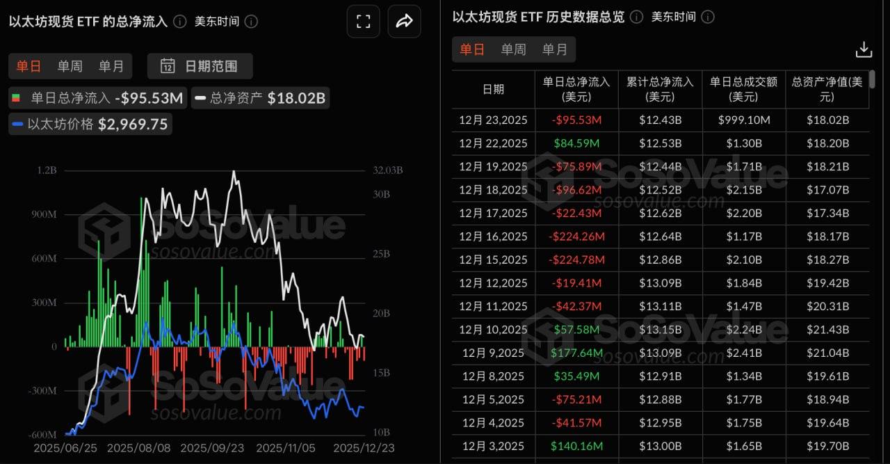 根據 SoSoValue 數據,昨日(美東時間 12 月 23 日)以太坊現貨 ETF 總淨流出 9552.86 萬美元。