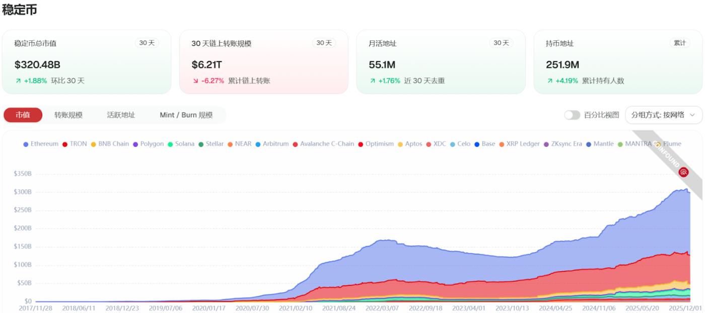 - 穩定幣表現穩健,作為市場避險錨定作用的功能凸顯,流動性充足,但因臨近聖誕節前夕,交易量與鏈上轉賬活躍度略有下降。