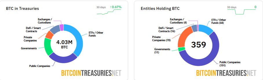據 BitcoinTreasuries 數據顯示,目前 191 家上市公司合計持有 1,087,794 枚比特幣,佔比特幣總量的 5.18%。其中,持倉量最大的 Strategy 持有 671,268 枚,占上市公司持倉的 61.7%。