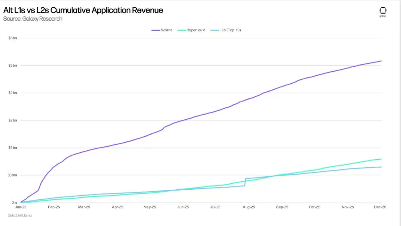 結果:這一預測未能實現。在網絡和應用層面,Layer 2 整體表現遜於主要的 Alt-L1 鏈。Solana 鞏固了其作為事實上的零售投機鏈的地位,持續佔據了全行業中交易量和手續費收入的最大份額。同時,Hyperliquid 成為永續合約交易的主導平臺,其單一平臺的累計應用收入就超過了整個 Layer 2 生態系統。儘管 Base 是唯一接近 Alt-L1 級別吸引力的 Layer 2 鏈——2025 年佔據了近 70% 的 Layer 2 應用收入——但即使是 Base 的增長也不足以超越 Solana 和 Hyperliquid 的經濟重心。