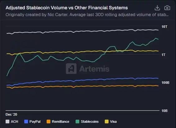 與傳統支付系統相比,穩定幣的流通速度顯著更高。我們已經看到穩定幣供應持續以 30%-40% 的年均複合增長率(CAGR)增長,交易量也隨之增加。穩定幣交易量已經超過了 Visa 等主要信用卡網絡,目前處理的大約是自動清算所(ACH)系統交易量的一半。隨著 GENIUS 法案的定義在 2026 年初敲定,我們可能會看到穩定幣增長速度超越其歷史平均增長率,因為現有的穩定幣將繼續增長,新進入者也將競爭這一不斷擴大的市場份額。