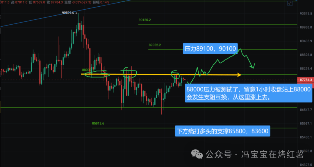 比特幣當前1小時級別在88000附近遇阻。後續若收盤能重新站穩該位置上方,則有望形成支撐阻力互換,向上測試89100與90100兩個壓力位。若無法突破,轉而向下,則需關注85800與83600兩個關鍵支撐。