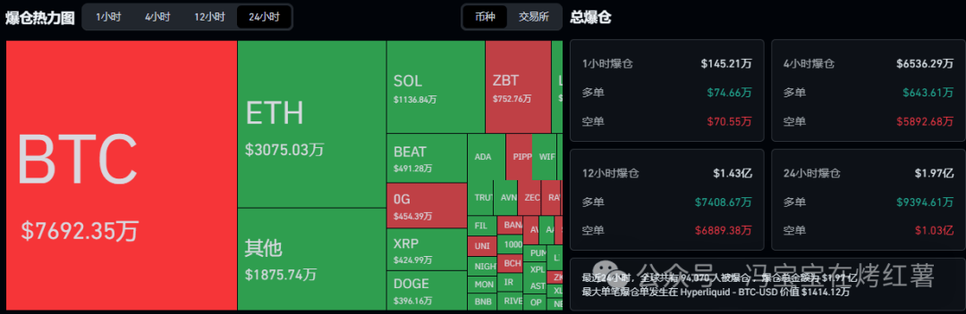 過去24小時全網共有94,070人被被爆倉,爆倉總金額為$1.97億美元,多單爆倉9394.61萬美元,空單爆倉1.03億美元。
