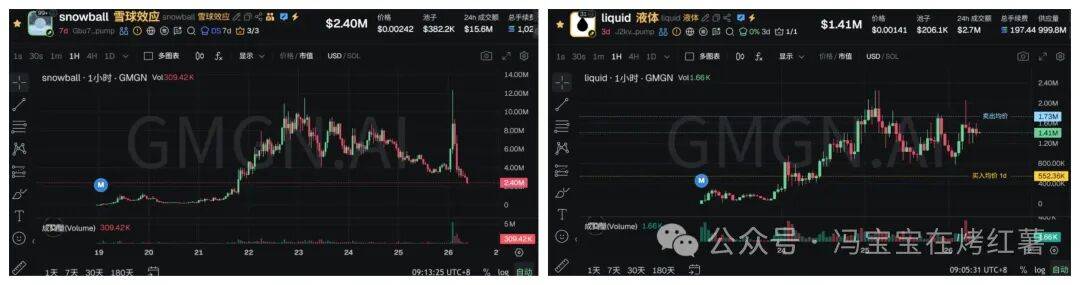 老盤子如$snowball深V後跌到200多萬,但$liquid穩在100多萬高位,龍頭交替接力,市場熱度持續,玩起來舒服多了。