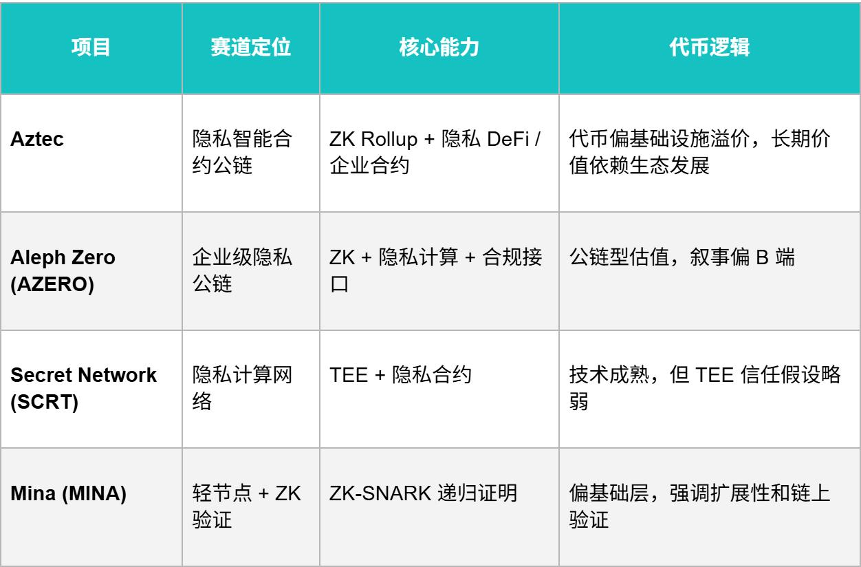 如果說隱私幣主要解決“個人轉賬隱私”,2025 年真正打開長期天花板的是零知識證明(ZK)驅動的隱私基礎設施賽道。這一分支不強調完全匿名,而強調“可驗證但不可見”,更適合機構、RWA 與企業級金融場景。ZK 隱私路線的核心優勢在於不與監管正面衝突,可服務 RWA、企業結算和隱私 DeFi,更容易被 TradFi、機構與政府系統接納。但其劣勢在於技術複雜度高、開發成本大,用戶體驗仍弱於傳統鏈,代幣價值捕獲路徑尚在早期。
