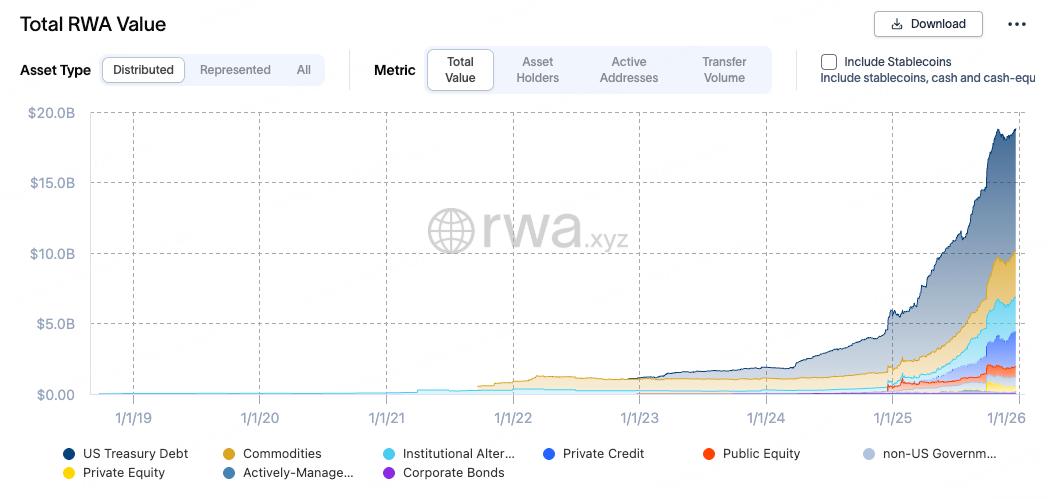 2025年,現實世界資產(RWA)賽道完成了從敘事到規模化落地的關鍵一躍,成為Web3領域確定性最高的增長引擎。數據顯示,其市場總價值實現了跨越式增長,標誌著行業已徹底脫離概念驗證階段,進入由機構化資本和清晰監管共同驅動的爆發期。這一爆發本質上源於RWA獨特的定位:在全球增長敘事中,它成為傳統資本(Old Money)與加密資本(New Money)罕見的價值共識交匯點,兩者在明確的監管試點和收益需求下形成合力,推動了市場的快速擴張。