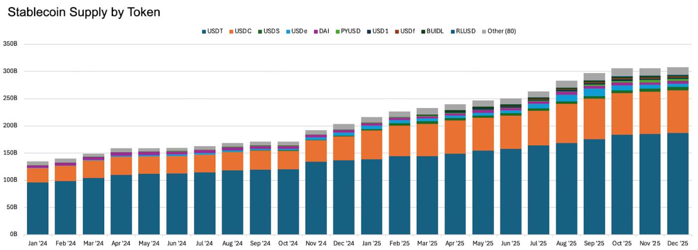2025年是穩定幣賽道的歷史性分水嶺。隨著美國《GENIUS法案》與歐盟MiCA等關鍵監管框架落地,穩定幣徹底告別“灰色金融工具”身份,進入高度合規化與制度化的競爭新紀元。其角色也發生根本性演變:從加密市場內部的交易媒介,升級為整個鏈上金融體系的基礎貨幣層。在這一背景下,穩定幣市場在2025年呈現出總量躍升與結構重塑的雙重特徵。從總量看,流通量較2024年實現顯著增長。這固然得益於全球貨幣政策的轉向寬鬆,但最直接的驅動力是監管破冰。明確的法律框架消除了傳統金融機構的合規疑慮,吸引了大規模機構資金入場。