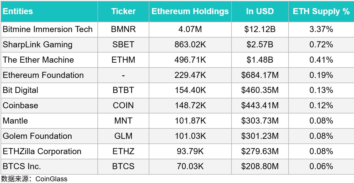 2025年ETH價格的大幅上漲與BitMine和SharpLink等企業大規模累積以太坊儲備的節奏密切相關。這些公司採取了類似於之前Strategy對BTC的資產負債表累積策略,通過定向增發、私募等融資方式持續買入ETH。其中,BitMine不斷擴大其ETH儲備量約407萬枚,佔ETH總供應量約3.37%,其持倉價值高達121.2億美元,遠超其他公司。緊隨其後的是SharpLink Gaming與The Ether Machine,分別持有約86.30萬和49.67萬枚ETH,用於支持其流動性佈局與生態參與;Coinbase的ETH庫存在很大程度上服務於交易所運營與網絡服務需求,而非純粹的資產增值策略。整體來看,上市公司ETH持倉既有積極押注以太坊生態成長的戰略性玩家,也有基於運營性需求或多元資產配置的參與者,這種差異化佈局表明ETH正被越來越多納入企業資產負債管理框架中,不再僅是交易或投機標的,而是具有戰略價值與生態協同作用的核心數字資產。