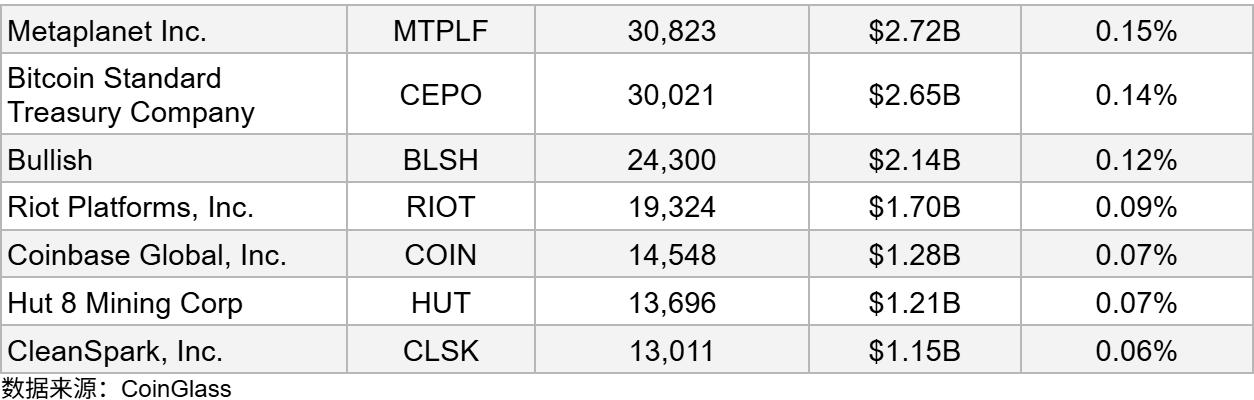 2025年BTC DATs儲備數據顯示,上市公司在比特幣配置上呈現明顯分層。Strategy以約671,268枚BTC位居首位,佔流通量約3.20%,儘管市場深度回調,其仍持續增持以鞏固市場定位。但其股票相對比特幣持倉的估值顯著壓縮,mNAV降至約1.08倍,處於近年低位,反映市場對其“比特幣代理股”屬性的信心下降。總體來看,頭部BTC DATs公司具備戰略優勢,但也面臨高估值波動風險。單一依賴BTC儲備的模式具備高beta特徵,在上漲週期放大收益,在震盪或下行階段則放大虧損與估值折價壓力。相比之下,業務多元化的公司(如Coinbase)表現出更強的風險緩衝能力。