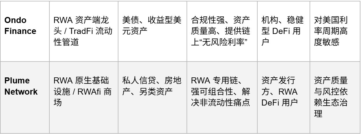 這一轉變的核心驅動力是 “收益疊加” 的投資邏輯。市場關注點不再是“能否上鍊”,而是“上鍊後如何高效組合”。通過將RWA資產(如美債的固有收益)與DeFi協議(如借貸、質押)結合,實現了“現實世界原生收益 + 鏈上金融收益”的雙輪驅動,極大提升了資本效率。在此邏輯下,賽道演化出兩類互補的核心玩家:以 Ondo Finance 為代表的資產端,專注於提供合規、安全的標準化收益資產(如代幣化國債),充當傳統流動性入口;以 Plume Network 為代表的基礎設施端,則致力於構建RWA原生的專用執行環境,通過集成發行、交易與DeFi組合,解決非標資產的流動性與可組合性問題。二者共同推動RWA向一個兼具機構級質量與鏈上可編程性的 “Web3華爾街” 演進。展望未來,隨著監管框架的進一步成熟,RWA賽道有望與高性能DeFi平臺深度融合,成為其最重要的資產來源,並孕育出更復雜的鏈上衍生品與結構化產品。