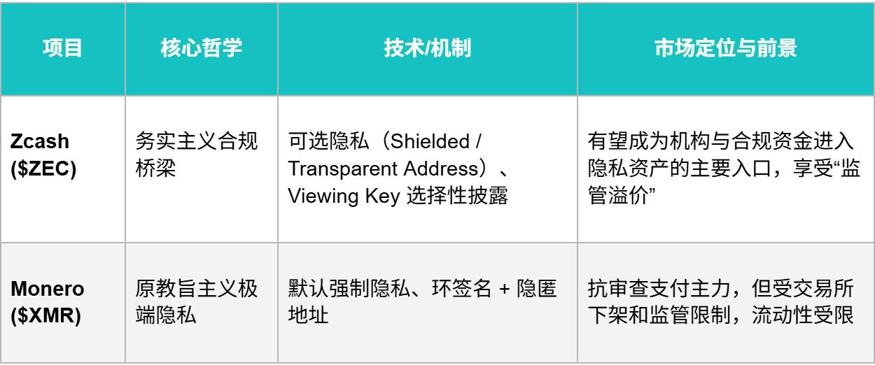 2025 年,隱私賽道內部出現了清晰的路線分化,以Zcash與Monero為代表的兩大隱私幣走向完全不同的生態位。Zcash 的優勢在於“可被監管理解”,以犧牲部分純粹性換取制度內生存空間;Monero 的優勢在於“不可審查”,但合規市場幾乎關閉,流動性高度受限。隱私幣的競爭,已從技術之爭演變為生存策略之爭。