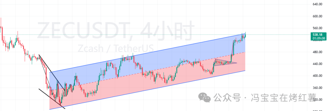 ZEC前幾日旗形看漲信號生效,價格加速上漲,上升楔形已突破失效。目前運行於上漲通道,現價接近上軌壓力位,雖然短期有回調需求,但回調後預計二次上漲,整體趨勢仍看漲,距前高仍有空間。若是突破前高就能再創歷史新高。