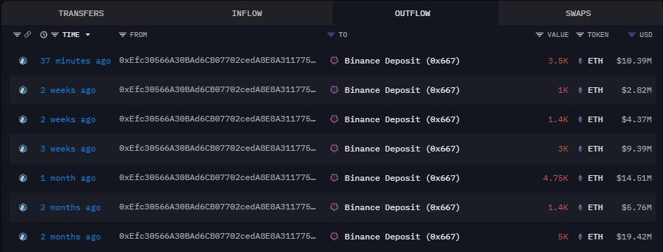 該地址在過去 3 個月內已向 Binance 總計存入 20,050 枚 ETH(約合 6,666 萬美元)。