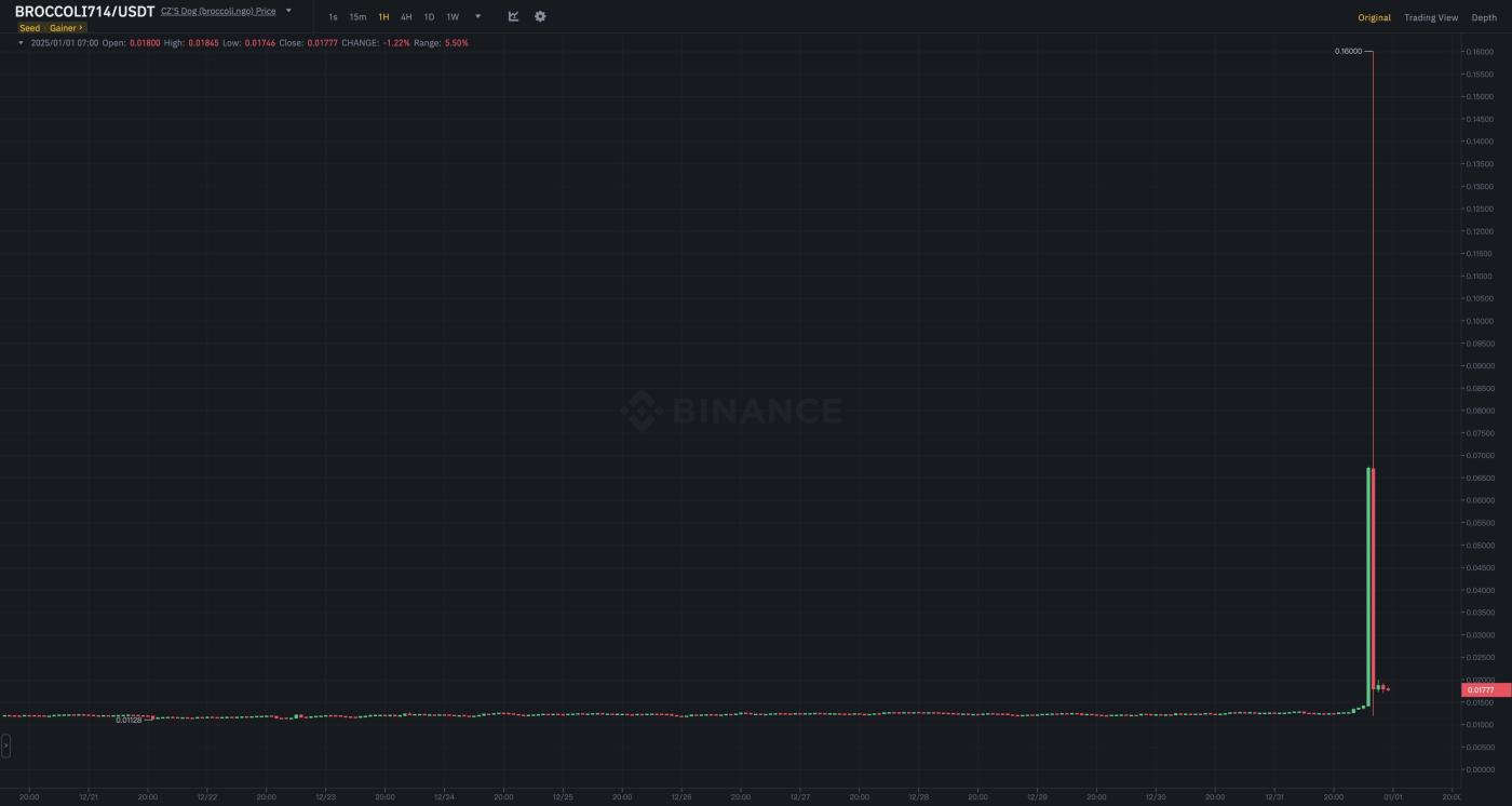 BROCCOLI714 / USDT 出現極端波動,盤中快速衝高回落吳說據 Binance 行情數據,今日凌晨,BROCCOLI714 / USDT 在 1 小時級別內出現極端拉昇行情,價格一度快速上衝,最高觸及 0.16 USDT,隨後迅速回落。目前該幣種現報 0.01752 USDT,24 小時內漲幅約 37.95%,期間現貨與合約市場曾出現明顯價差。Broccoli是一個社區驅動的模因幣,基於幣安智能鏈,靈感來自趙長鵬(CZ)心愛的狗Broccoli。來源免責聲明:以上內容僅為作者觀點,不代表Followin的任何立場,不構成與Followin相關的任何投資建議。喜歡收藏 評論分享相關推薦Bitpush2026開局獲利百萬:「戰神」Vida覆盤BROCCOLI714事件交易全過程BeInCrypto Việt NamPi Network 在被騙走 440 萬枚 Pi 幣後,已暫時停止支付請求。PI0%Bitpush【比推每日新聞精選】美股2025年收官:三大股指均連續三年創新高;Galaxy Digital:比特幣將在 2027 年底達到 25 萬美元;沃倫·巴菲特正式退休,卸任伯克希爾哈撒韋首席執行官;數據:兩大預測市場Kalshi與Polymarket 2025年總交易量已超440億美元GLXY0%