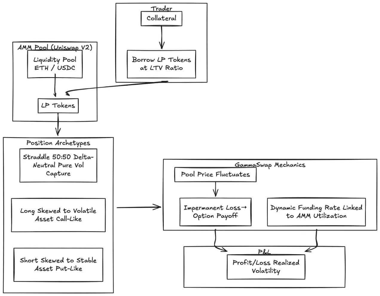 - 期權作為動態對沖工具:Uniswap v3/v4 中的 LP 可以通過買入看跌期權或構建 delta 中性價差來降低無常損失。GammaSwap 和 Panoptic 允許流動性作為抵押品,用於持續期權收益,從而抵消 AMM 的風險敞口。