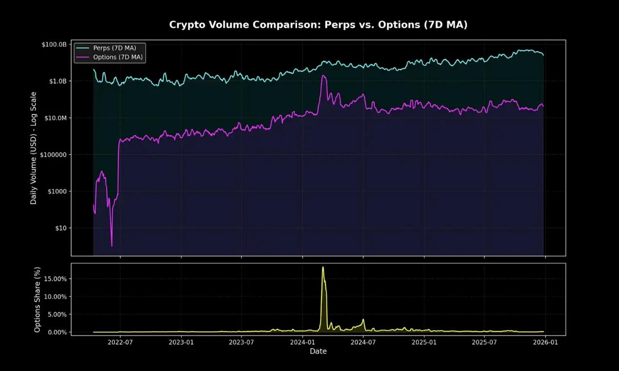 儘管目前鏈上期權僅佔加密衍生品交易量的一小部分,但永續合約在市場中仍佔據絕對主導地位。這種差距與 TradFi 期權在 Robinhood 普及之前的情況如出一轍。