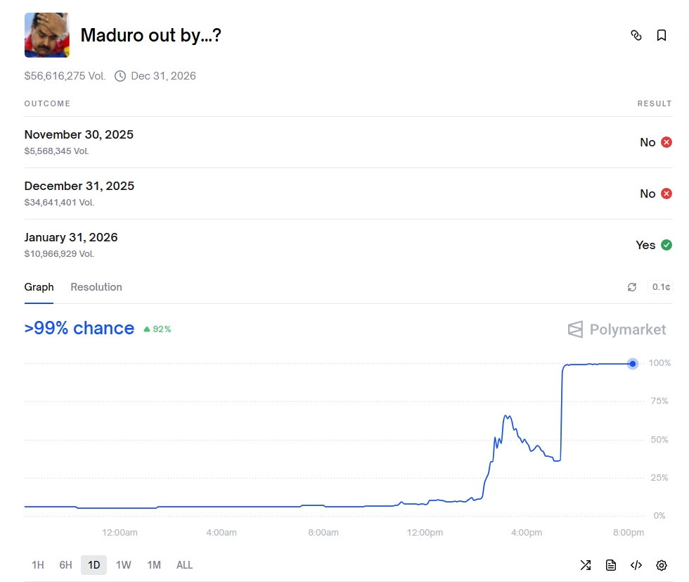 美東時間 1 月 2 日晚間 10 點,去中心化預測平台 Polymarket 上「馬杜羅是否 1 月下台」合約價格突然跳升,事件在三小時後獲得證實,美國總統川普宣布美軍逮捕委內瑞拉總統馬杜羅。這些押注馬杜羅的金額總達 5600 萬美元。