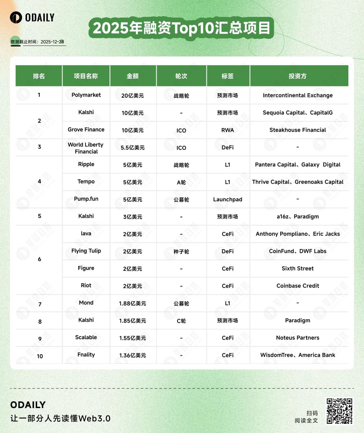 從 2025 年融資金額 Top 10 的榜單中可以看出,Polymarket 與 Kalshi,幾乎構成了 2025 年融資的全部敘事。