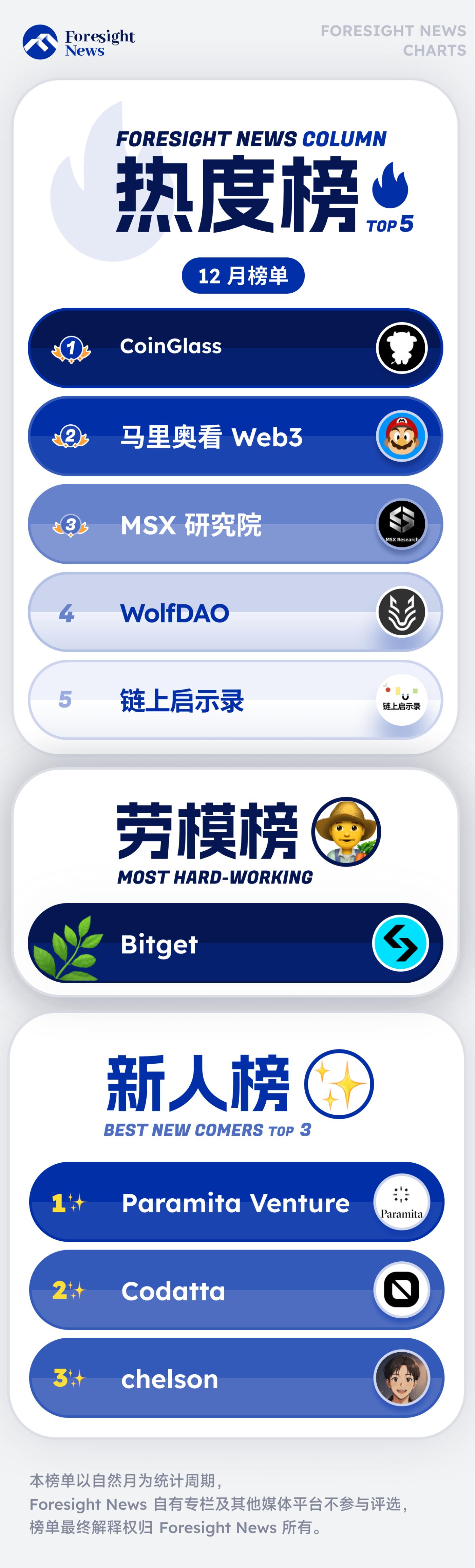 Foresight News 根據 2025 年 12 月份專欄作者文章閱讀量、內容質量、發文數量等數據,綜合評定出當月熱度榜 Top5、勞模榜 Top1 及新人榜 Top3,並附上其專欄下優秀文章推薦: