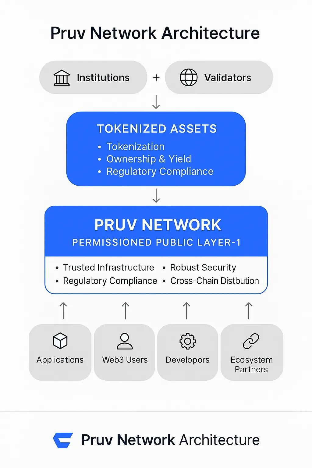 Pruv Network 是一個專門用於現實資產代幣化的金融級 Layer-1 區塊鏈,旨在將傳統金融資產安全、合規地帶入 Web3。網絡僅允許全球持牌金融機構擔任驗證節點,確保資產發行、管理與結算的安全性與可信度。
