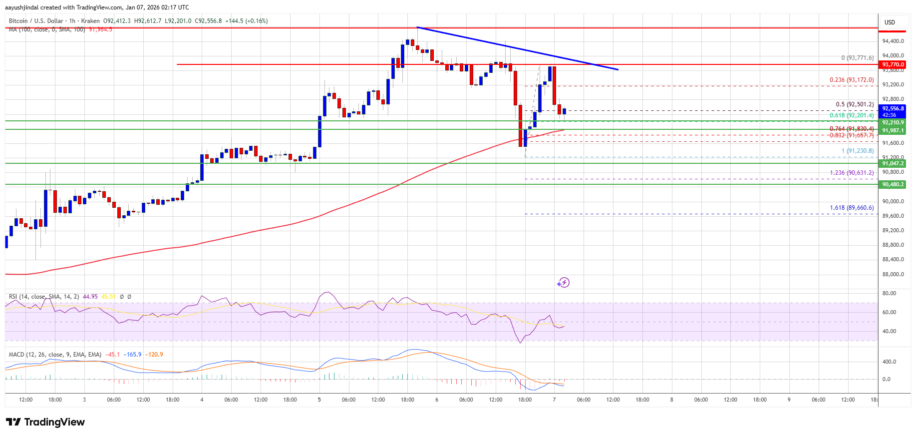 如果比特幣未能突破 93,500 美元的阻力位,則可能開始新一輪下跌。直接支撐位在 92,000 美元附近。第一個主要支撐位在 91,800 美元附近,或近期從 91,230 美元低點到 93,771 美元高點上漲行情的 76.4% 斐波那契回撤位。