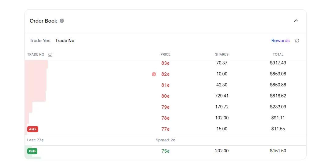 你看其他的價位也可以一一對應上,價格就是公式:YES + NO = 1,當然 18 對應的就是 0.18,82 對應的就是 0.82,這裡顯示成兩位數是方便讓大家理解為這是概率。