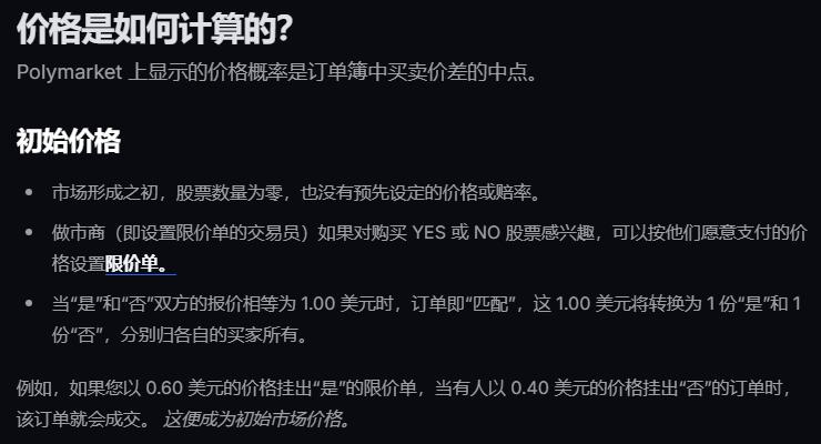 如果你去 Polymarket 的官方文檔查閱,會發現價格的計算解釋是這樣的: