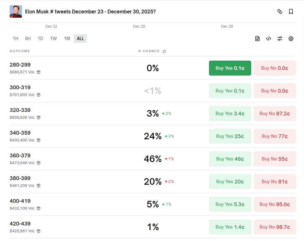- Will Elon Musk post 0-19 tweets from December 23 to December 30, 2025?