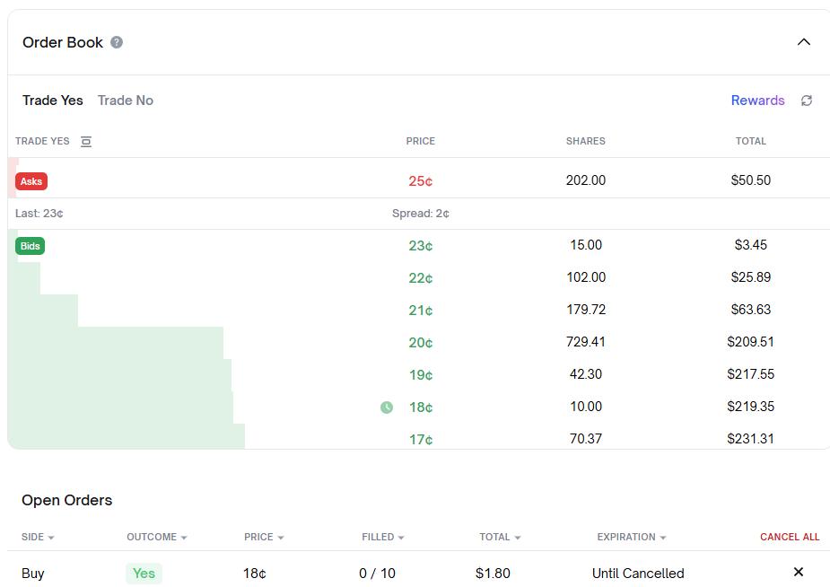 我找了一個交易沒那麼活躍的市場,掛了一個價格 18、數量 10 的 YES 買單: