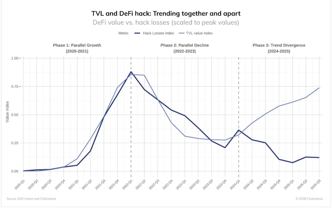 這使得第三階段的差異更加顯著。DeFi TVL 已從 2023 年的低點顯著回升,但黑客攻擊造成的損失卻並未隨之增加。儘管數十億美元已回流到這些協議,但 DeFi 黑客攻擊事件卻持續保持較低水平,這代表著一個意義重大的變化。