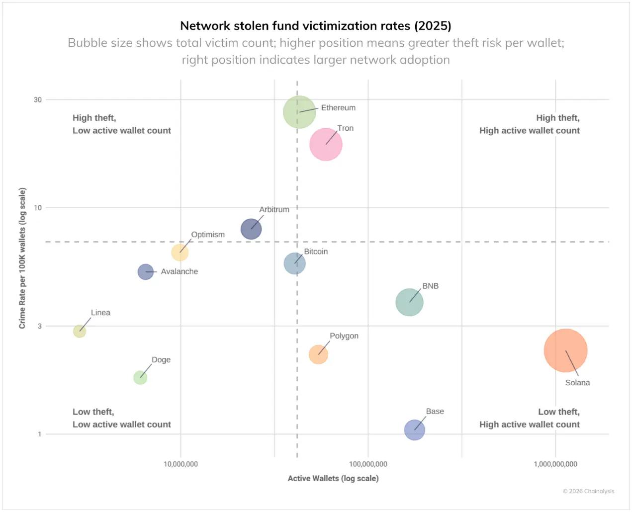 這表明個人錢包在加密生態中的安全風險並非均等。即使技術架構相似,不同區塊鏈的受害率也存在差異,這表明除了技術因素之外,用戶群體特徵、熱門應用和犯罪基礎設施等因素在決定盜竊率方面也發揮著重要作用。