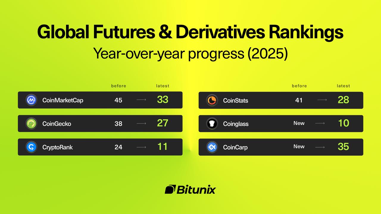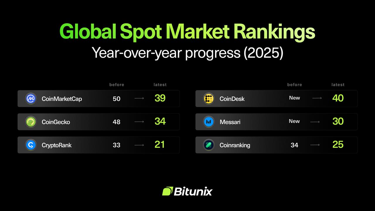 上述多項進展,共同支撐 Bitunix 在全球現貨與衍生品市場排名的年對年提升。