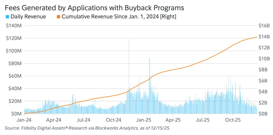 在我們看來,市場對這一新興回購元趨勢的反應很明確:與協議收入有可信聯繫的代幣越來越被視為早期階段、類似於股權的對業務索取權,而非單純的“治理籌碼”。我們相信,在2026年,總應用費用的更大份額將回流到數字資產代幣。