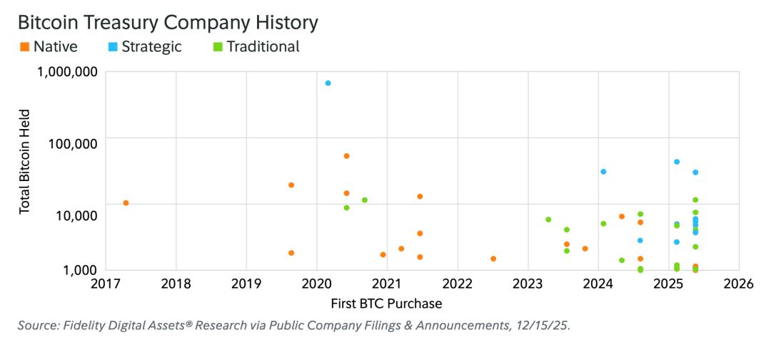 在“比特幣國庫公司歷史”圖表中,每個數據點代表一家公司,x軸為其首次收購日期,y軸為持有比特幣總量。