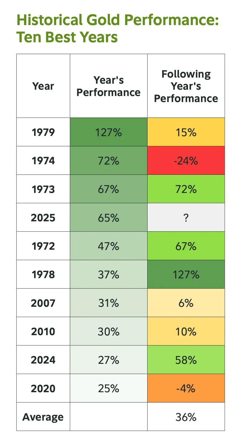 幸運的是,2025年市場並未出現滯脹情景的經濟收縮或高通脹,儘管通脹仍頑固地更接近3%而非聯儲的2%目標。然而,看黃金的破紀錄行情,你不會這麼想。黃金在2025年回報65%,是自1970年代和1980年代滯脹時期以來最高的年度漲幅之一。