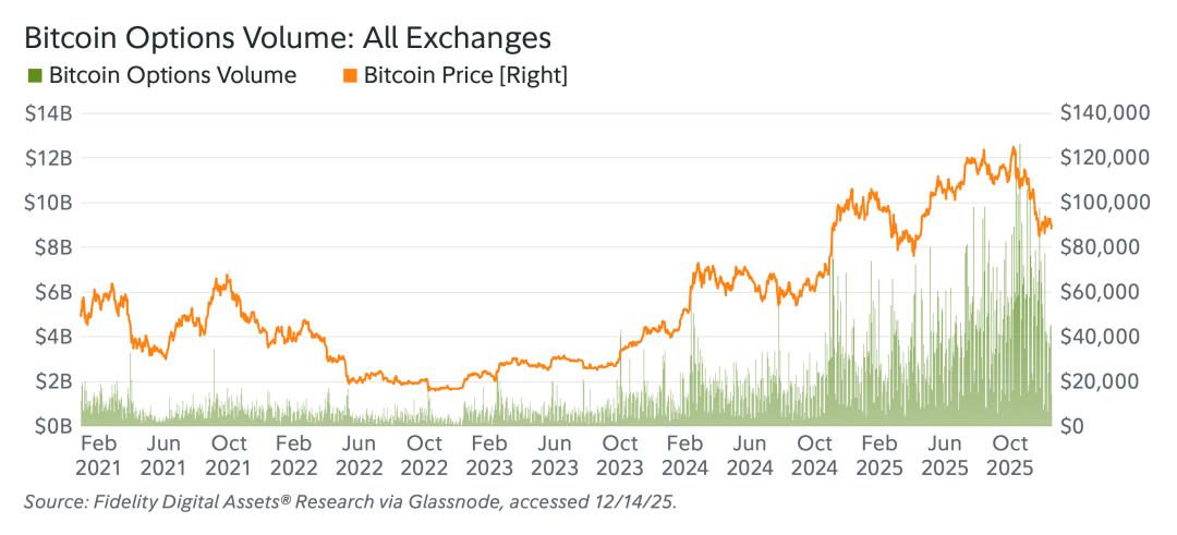 ETP期權也已成為更廣泛期權市場的主要部分,自2000年代初以來獲得牽引力。與其他資產類別類似,比特幣ETP期權深受投資者歡迎。這一趨勢在2025年秋季拋售期間顯而易見,當時交易活動激增,看跌期權成交量創紀錄,未平倉量攀升至400億美元。