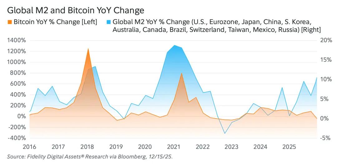 Fidelity Digital Assets的研究顯示,比特幣與流動性狀況——更具體地說是M2貨幣供應量——之間存在緊密相關性。當M2擴張時,通常反映央行或政府通過降低利率、量化寬鬆、財政支出或增加貸款向系統注入流動性的政策。稀缺資產如比特幣往往從中受益,充當“流動性海綿”。將比特幣價格與全球經濟體M2增長率比較時,有明顯相關性:比特幣傾向於隨M2供應增長而上漲。