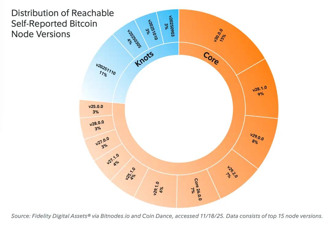 到2025年10月中旬,即使Bitcoin Core v30正在發佈,Knots的份額仍在繼續增長。有趣的是,截至2025年12月15日,Bitcoin Core v30節點佔網絡的15%以上,而Knots版本29.2緊隨其後,佔11%。