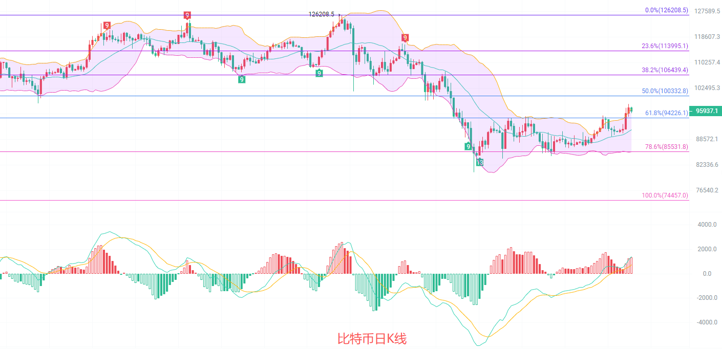 日K線發稿前最高97150,最低95400,EMA趨勢指標多頭趨勢依舊在收縮,中線支撐在94000不變,MACD連續放量增籌,DIF和DEA向上擴散有減速的情況出現,EMA60趨勢支撐關注95200,加上黃金分割線0.618支撐,底部的雙支撐,給了北上幾次入場時機,布林帶上軌96600,目前K線回到了通道內,但趨勢依舊是多
