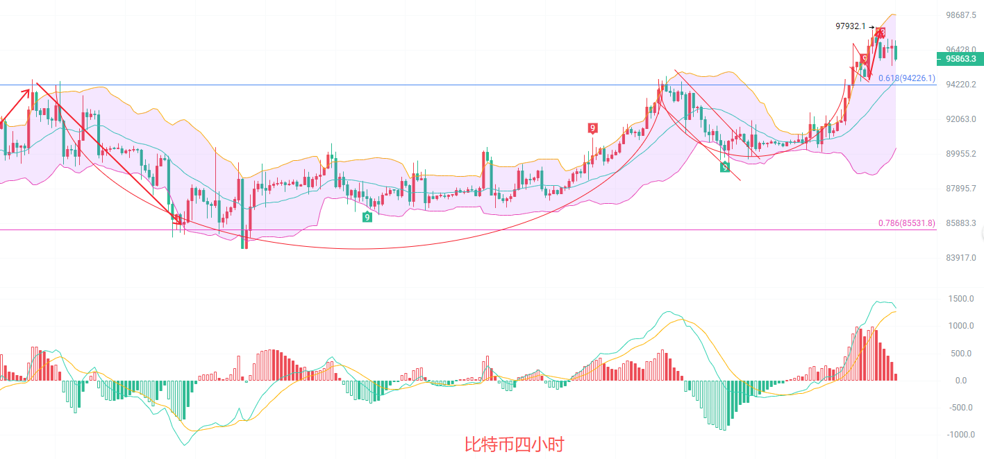 四小時K線上升旗型形態明顯,EMA30和0.618分割線交替形成強壓的94200,MACD頂部背離放量減少,K線遭遇強支撐,布林帶中規關注94500,短線從96000到94500有回調的空間,不是很大也是有利可圖,激進的幣友可以抓一下,穩健的幣友等回調支撐北上為主