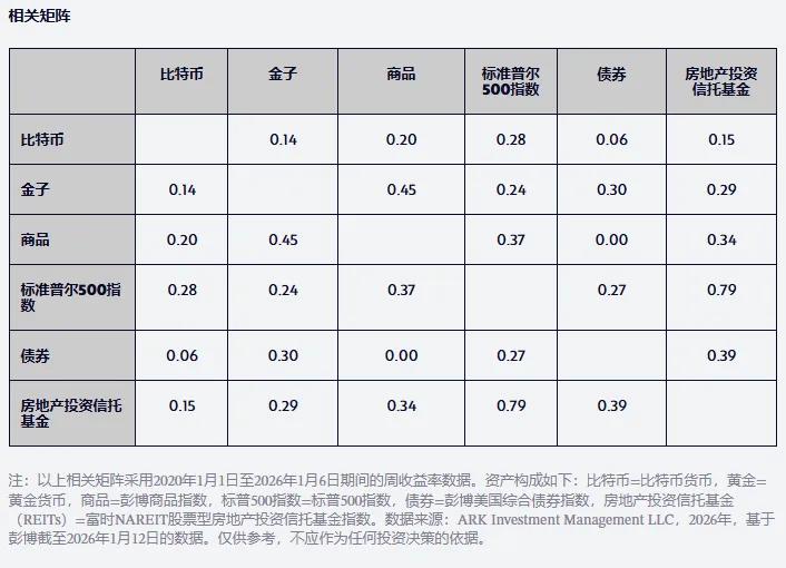 對於資產配置者而言,另一個重要的考量因素是比特幣收益相對於黃金收益以及自 2020 年以來與其他主要資產類別收益的相關性較低,如下表所示。