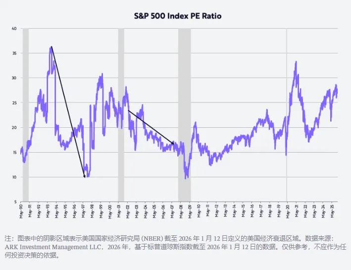 她指出,雖然目前市盈率處於歷史高位,但隨著 AI、機器人等技術推動生產力爆發,企業盈利增長將消化高估值,市場可能會在市盈率壓縮的同時實現正回報,類似於 1990 年代中後期的牛市路徑。