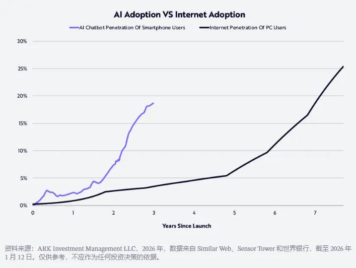 AI 公司是歷史上增長最快的企業之一。我們的研究表明,消費者接受 AI 的速度是上世紀 90 年代接受互聯網速度的兩倍,如下所示。