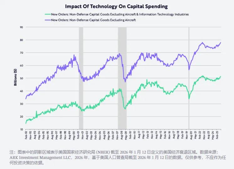 與此同時,以非國防資本品(不包括飛機)衡量的資本支出在 2022 年中期達到峰值,此後無論是否受到技術影響,該支出水平都已回升至該水平。