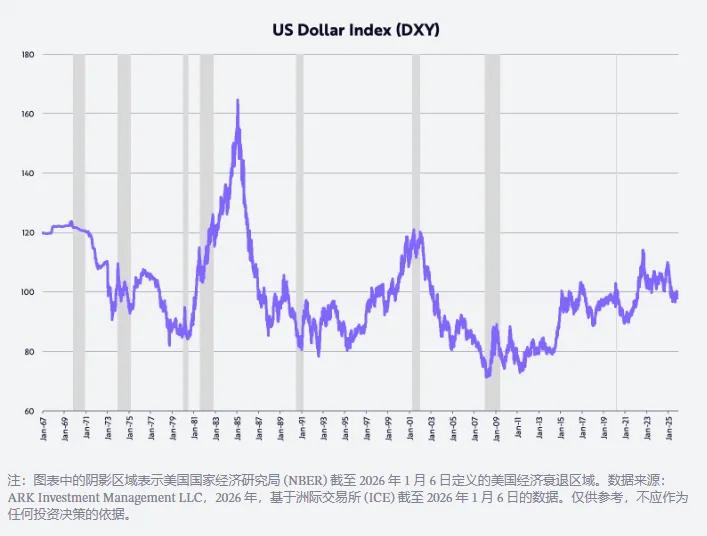 在市場影響方面,Wood 預測美國投資回報率的相對優勢將推動美元匯率大幅走高,重演 1980 年代美元幾乎翻倍的行情。
