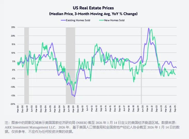 具體來看,Cathie Wood 認為,儘管過去三年實際 GDP 持續增長,但美國底層經濟實則經歷了一場滾動式衰退,目前正處於“蓄勢待發”(coiled spring)的狀態,有望在未來幾年強勁反彈。