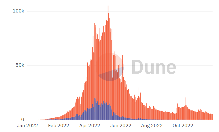 根據 dune 上的統計顯示,目前 StepN 每日活躍使用者還不到5千,僅有巔峰時期5%左右,其中Solana 鏈上的活躍使用者更是僅有一百人,這個發跡於 Solana 鏈上 X-to-Earn 鏈遊,如果不是BNB鏈上還維繫著基礎的使用者,或許早已涼透。